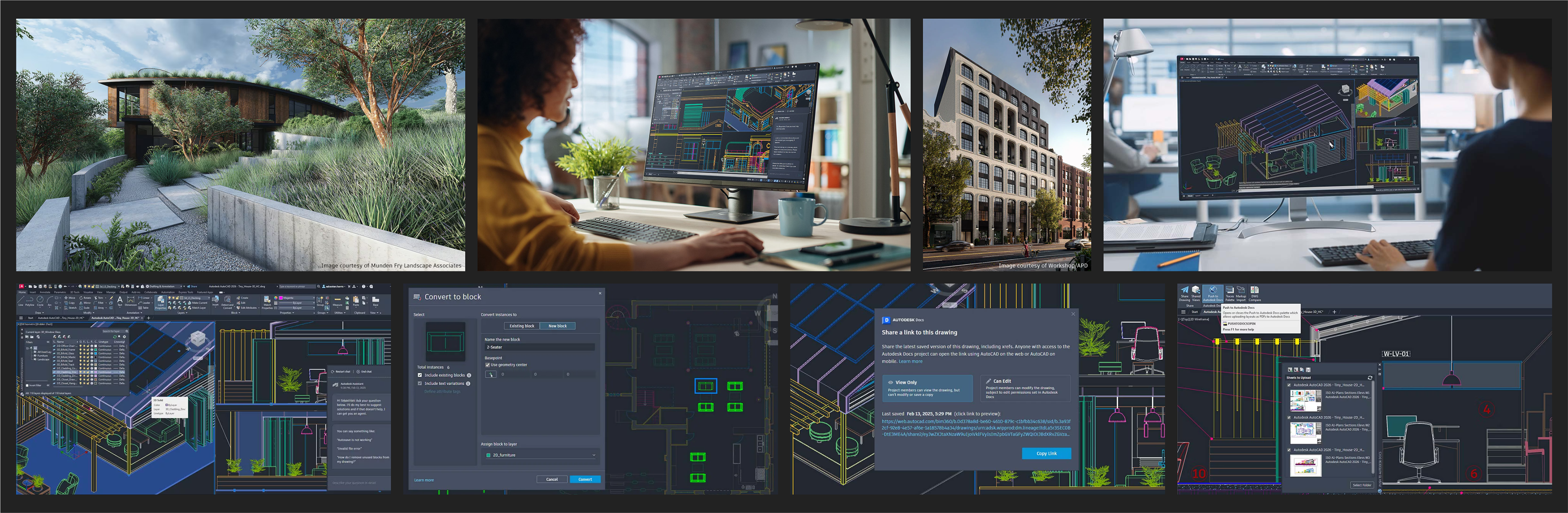 O AutoCAD inclui conjuntos de ferramentas específicos do setor, bem como fluxos de trabalho aprimorados em desktop, na Web e em dispositivos móveis, além de novos recursos como a palheta Blocos.